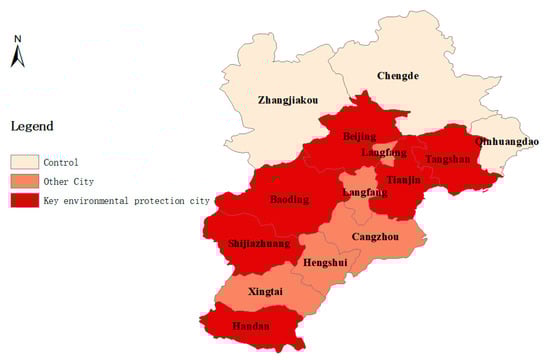 Rows (1)–(12) can further verify the robustness of the basic regression results. Whether it is a key environmental protection city or not, the BSDW policy will significantly reduce the concentration of air pollutants, except for NO2. For PM10, the estimated coefficient of the policy variable in key environmental protection cities is −4.323 under 1% significance, and the corresponding coefficient in other cities is −2.396 under 1% significance. As shown in Table 4, compared with the key environmental protection cities, the emission reduction effect of the BSDW policy in other cities is generally low. Figure 4 depicts the distribution of key environmental protection cities and other cities. The industrial distribution in BTH region plays an important role. Heavy industry leads to massive energy consumption (most of which is still provided by coal), and the most polluting is in the south of BTH region, which leads to serious air pollution [].