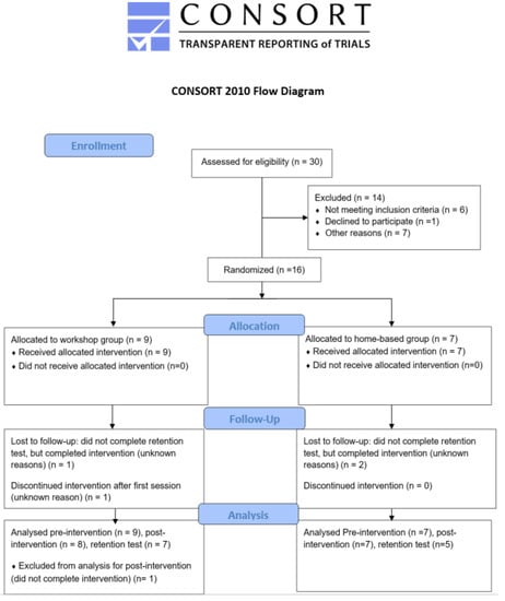 | Group 1 (Workshop) N = 8 | Group 2 (Home-Based) N = 7 | |