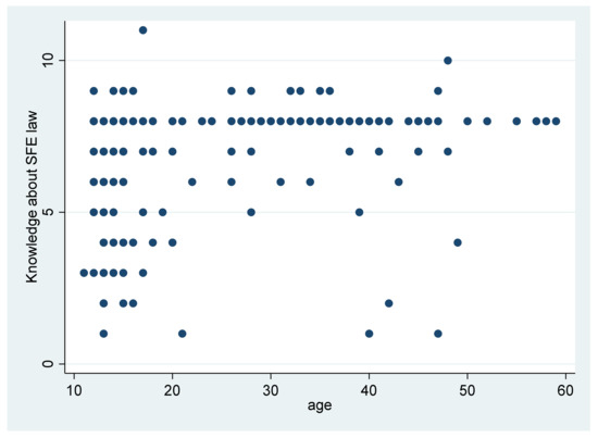 Among the 11 questions about the SMF law, 1–11 were answered correctly (Figure 1). Although the single respondent who answered all 11 questions correctly was a student, on average, the adults answered more questions correctly (mean = 7.48) than the students (mean = 6.52). The average difference was 0.97 (p < 0.001). The smokers indeed gave on average more correct answers (7.3 of a possible total of 11) than the non-smokers (6.9). However, this difference was not significant.