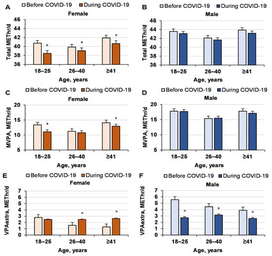 Total METs decreased significantly for men and women because of COVID-19 (COVID-19 effect, p = 0.001, η P 2 = 0.001, OP = 0.93; age effect, p < 0.0001, η P 2   = 0.004, OP = 1; gender effect, p < 0.0001, η P 2 = 0.11, OP = 1; interaction effect, nonsignificant, n.s.; Figure 1). Moreover, MVPA did not decrease significantly because of COVID-19 (COVID-19 effect, p = 0.086, η P   2 = 0.001, OP = 0.61; age effect, p < 0.0001, η P 2 = 0.005, OP = 1; gender effect, p < 0.0001, η P 2 = 0.02, OP = 1; interaction effect, n.s.). Thus, COVID-19 reduced total METs but did not change MVPA irrespective of age, although the MVPA of women aged 18–25 y decreased significantly (p = 0.011).