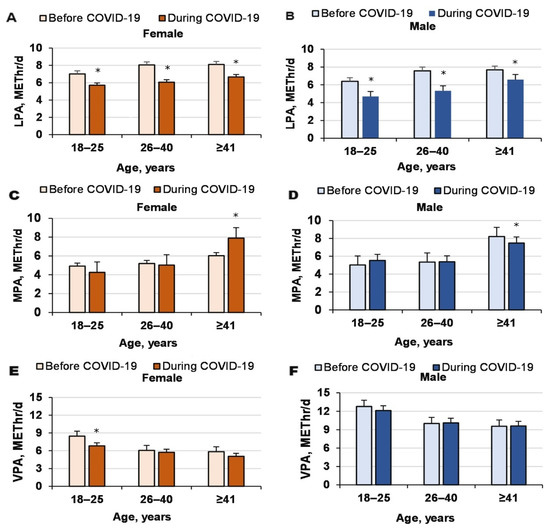 LPA decreased significantly because of COVID-19 (COVID-19 effect, p < 0.0001, η P 2   = 0.002, OP = 1; age effect, p < 0.0001, η P 2 = 0.006, OP = 1; gender effect, p < 0.0001, η P 2 = 0.017, OP = 1; interaction effect, n.s.; Figure 2). Interestingly, VPAextra increased for women (26–40 and ≥41 years) and decreased for men because of COVID-19 (interaction effect, COVID-19’ gender: p < 0.0001, η P 2   = 0.009, OP = 1). Neither VPA (COVID-19 effect, p = 0.076, η P 2 = 0.001, OP = 0.51; age effect, p < 0.0001, η P 2   = 0.007, OP = 1; gender effect, p < 0.0001, η P   2   = 0.034, OP = 1; interaction effect, n.s.) nor MPA changed significantly because of COVID-19 (COVID-19 effect, p = 0.27, η P 2 < 0.0001, OP = 0.21; age effect, p < 0.0001, η P 2 = 0.009, OP = 1; gender effect, p = 0.21; η P 2 < 0.0001, OP = 0.27, interaction effect, n.s.; Figure 2).