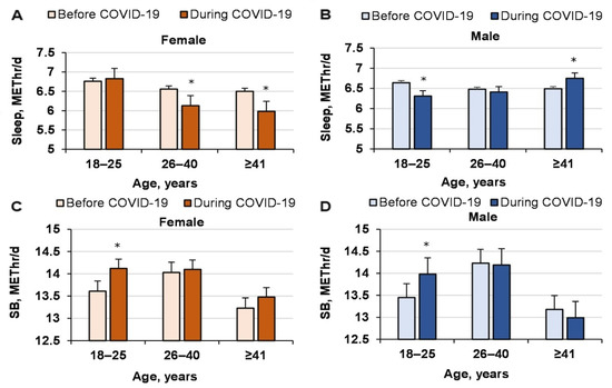 Figure 3. Sleep and sedentary behavior (SB) METs before and during COVID-19 for men and women of different ages. * compared to before COVID-19.