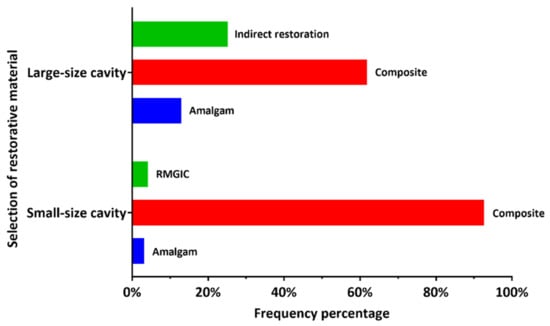 Dental practitioner-reported frequency of the selection of restorative material for small-size and large-size posterior cavity preparations (RMGIC: resin-modified glass ionomer cement).