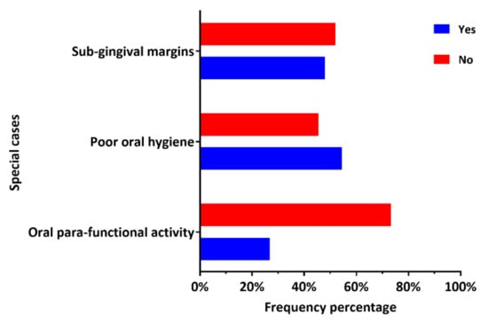 The use of composite in special cases as reported by the participants is graphically described in Figure 2. In addition, more detailed descriptive statistics and comparison between DPs working in the governmental and private sectors are provided in Table 2. The placement of posterior composite restorations in patients with occlusal parafunctional activity, with poor oral hygiene, and in cavities with subgingival margins was reported by 33 (26.8%), 67 (54.5%), and 59 (48%) dental practitioners, respectively. There was no statistically significant difference between the dental practitioners’ working in the governmental and private sectors (p > 0.5).