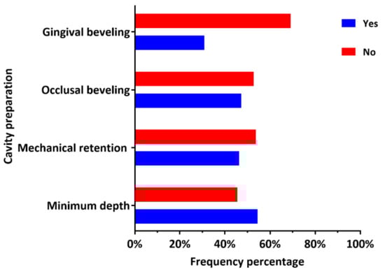 The cavity preparation could influence the quality of posterior composite restorations, although the effect of inappropriate cavity preparation would not be visible immediately after the restoration insertion []. Despite that, there is no consensus on teaching the principles of cavity preparation for posterior composite restorations in North America [] or Saudi Arabia []. Beveling of occlusal cavity margins seems to be confusing to the dental practitioners in Al-Kharj area as almost half (47.2%) of them reported beveling the occlusal cavity margins during preparations for posterior composite restorations. Beveling of the occlusal margins should be contraindicated [,], as it might result in unnecessary loss of non-carious tooth structure and confusion during restoration finishing, repair, or replacement [,,]. Approximately one-third (30.9%) of the participants reported beveling of gingival cavity margins, which might also lead to the loss of sound tooth structure [] and affect the marginal integrity of composite restorations. It might also create composite flashes in the interproximal space, complicating the restoration finishing procedures due to limited accessibility []. Surprisingly, creating mechanical means for retention and a minimum depth of 2 mm of composite restoration were reported by many participants (46.3% and 54.5%, respectively), unnecessary for posterior composite restorations [].
