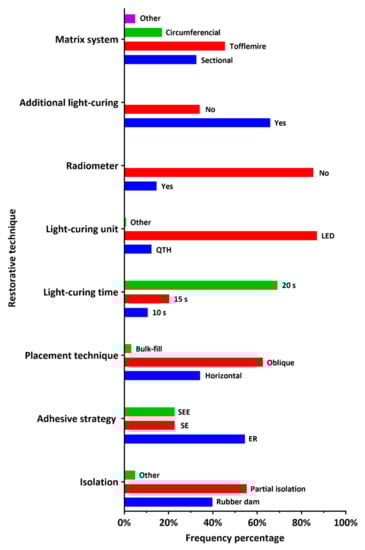 Steps of the restorative technique as reported by the participant DP are graphically described in Figure 4. In addition, more detailed descriptive statistics and comparison between DP working in the governmental and private sectors are provided in Table 4. A total of 49 (39.8%) dental practitioners reported using a rubber dam for operative field isolation. The etch-and-rinse adhesive strategy was the most reported by 67 (54.5%) of the dental practitioners. A total of 77 (62.6%) dental practitioners reported the use of the oblique layering technique during the insertion of posterior composite restorations. The light curing of 2 mm composite layer (increment) for 20 s was reported by 85 (69.1%) of the dental practitioners. The light emitting diodes (LED) light-curing units were the most used for this purpose, as reported by 107 (87%) dental practitioners. Surprisingly, only 18 (14.6%) dental practitioners reported regular monitoring of the light-curing units by a radiometer. Additional light-curing intervals after the removing the metal matrix band were reported by 81 (65.9%) of the dental practitioners. The use of a Tofflemire metal matrix system for restoring the proximal contact with posterior composite restorations was reported by 56 (45.5%) practitioners, while only 40 (32.5%) and 21 (17.1%) reported the use of a sectional or circumferential matrix system, respectively, for the same purpose. There was a statistically significant difference between the dental practitioners’ working in the governmental and private sectors with regard to a total of five steps of the restorative technique applied during the placement of posterior composite restorations, namely the method of operative field isolation (p = 0.004), the adhesive strategy used (p < 0.001), the light-curing unit type (p = 0.013), the regular use of radiometer to monitor the output of the light-curing unit (p = 0.023), and the selection of the matrix system for restoring the proximal contact with composite restoration (p < 0.001).