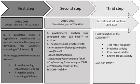 The SCOOHP questionnaire was developed between June 2016 and November 2018 in a monocentric qualitative study carried out at the Hospital Centre la Chartreuse in Dijon (France). This study involved 34 people (24 PWS and 10 health professionals) [12]. The PWS questionnaire was developed and structured with data collected during semi-structured interviews with 20 PWS and six health professionals, and two focus groups with eight different people (1 FG with 4 people with PWS and 1 FG with health professionals). Only items related to the concept of oral health adaptation were retained for the construction of this questionnaire [12]. A psychometric validation study of this scale has been underway since 2018, with a large sample of PWS recruited from five French hospitals (Dijon, Tours, Reims, Millau and Paris). The study was registered with www.ClinicalTrials.gov (accessed on 1 October 2021) under the number NCT03699501.