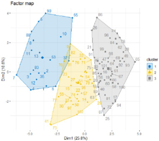The first axis of the principal component analysis (PCA) concentrates 25.8% of the information. The second, third, fourth, fifth, and sixth axes contained 10.60%, 8.4%, 6.9%, 6.4%, and 5.3%, respectively. We use approximately 63.4% of total variance, in the first six axes, retained for the confirmatory factor analysis. In Figure 3, we show the individuals’ factor maps for the SCOOHP scale with 23 items.