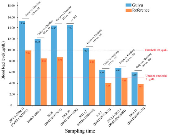 Pb, one of the ubiquitous and persistent environmental toxicants in e-waste, is associated with many health hazards and has attracted the most attention. Findings from 48 epidemiological studies quantifying blood lead levels (BLLs) of inhabitants living in Guiyu are presented in Table S1. Majority of them (>93%) showed BLLs were higher in Guiyu locals. According to the BLLs diagnostic criteria (10.0 µg/dL) for children defined by the U.S. Centers for Disease Control and Prevention (US-CDC) [9], we found eleven studies [10,11,12,13,14,15,16,17,18,19,20] reporting elevated BLLs. Aside from one study [20] that included no sampling times (used “publication year” as an alternative proxy, see Table S1), all the blood samples of other eight studies were obtained before 2013 (Table S1). There has been a dramatic reduction over the past few years in BLLs of children in Guiyu. This may be attributed to the implementation of restriction policies, such as the Management Regulation on the Recycling of Waste Electrical and Electronic Products, promulgated and enforced by the local and national government in the last decade [21,22]. These policies forbid the use of inappropriate and unsafe recycling activities. For example, in 2004, two cross-sectional studies by Xu et al. [19] and Huo et al. [17] found that mean BLLs of children1~6 years old in Guiyu approached 15.30 μg/dL (arithmetic mean). However, in 2014 the BLLs of Guiyu children decreased to 5.06 μg/dL (geometric mean) [23] and 6.00 μg/dL (arithmetic mean) [24]. Elevated BLLs in early childhood are detrimental to neurodevelopment; the recognized adverse effects include impaired cognitive function, attention deficit, hyperactivity, etc. [25]. Following reduction of BLLs observed all over the world, the evaluation threshold of BLL was set lower. In 2012, the CDC updated the threshold value for childhood Pb-exposure downward from 10.0 μg/dL to 5.0 μg/dL [26]. However, there is still no consensus view on how much for Pb exposure is harmful for human health, and it is currently accepted that there is no poisoning safety limit of Pb, particularly for children and neonates. Although BLLs of children in Guiyu have been reduced from around 15 μg/dL to 6.00 μg/dL in the past ten years (Figure 2), the current BLLs of children are still higher than that of reference areas, indicating that children are more sensitive to e-waste exposure and thus have higher potential health effects compared with adults.