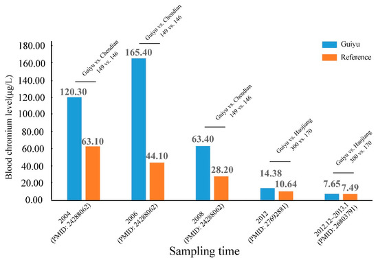 Cr is used in metal coatings of some electronic devices for corrosion protection. Cr has two main valence states: Cr (trivalent Cr(Cr 3+)) is an essential trace element required for glucose and insulin homeostasis, while Cr (hexavalent Cr (Cr 6+)) is known for its genotoxic activity. Body burden of Cr from e-waste has become a worldwide issue of significant public health importance; Guiyu is one of the hardest-hit regions in terms of Cr pollution. Seven studies analyzed the relationships between Cr levels and e-waste exposure (Table S3). Similarly, there has been a dramatic reduction in Cr concentrations of children in Guiyu over the past eight years, ranging from 174.3 μg/L (arithmetic mean) [30] or 165.4 μg/L in 2006 [31] to 7.65 μg/L (geometric mean) in 2012 [28] (Figure 3). However, the normal value of Cr varies person to person; generally, the total quantity of Cr (Cr 3+) in an adult body is 5~100 mg. As Cr is distributed in organs, tissues, and body fluid, the normal value of blood Cr is 0~0.2 μg/L, while Cr in tissue is 10~100 times than that in blood [32]. According to Nomiyama et al. [33], normal safety range of blood Cr is 1.0~3.0 μg/L. Zeng et al. [34] found approximately 96% of children in Guiyu had a blood Cr > 5.0 μg/L, numerically higher than control group. Consistent with this study, Zheng et al. [35] demonstrated that blood Cr was slightly higher in children (10~11 years) from Guiyu. Another two studies [28,31] posed the conformity results; one [31] reported that Guiyu children had significantly higher blood Cr in 2004, 2006, and 2008; and the other [28] demonstrated blood Cr was still higher in 2012 (see Table S3 and Figure 3).
