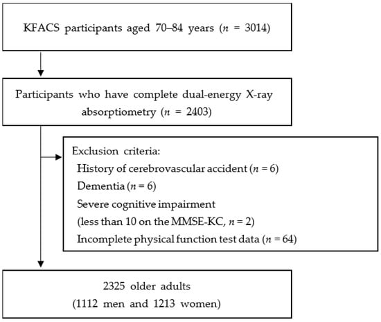 We used data from the KFACS to investigate the relationship between B12 levels and sarcopenia as defined by the AWGS. The KFACS is a nationwide, multicenter study performed in eight medical and two public health centers across South Korea of older community dwellers between 70 and 84 years of age. Among the 3014 participants, data were excluded if there were incomplete data on B12 levels or DEXA, weakness due to cerebrovascular accident, deformity or motor deficit in the extremities, blindness, or an inability to complete the physical performance test including a 4 m walking speed and Short Physical Performance Battery (SPPB) test. Finally, 2325 participants (1112 men; 1213 women) were included in the study (Figure 1). Baseline demographic data and medical history, including age, sex, years of education (<6, 6–12, and >12 years), location of residence (rural or urban), smoking and alcohol habits, body mass index (BMI), and chronic comorbidities, were collected. Those who smoked more than one cigarette per week and drank alcohol at least once a week were defined as smokers and drinkers, respectively. The KFACS protocol was approved by the Institutional Review Board (IRB) of the Clinical Research Ethics Committee of the Kyung Hee University Medical Center (IRB number: 2015-12-103), and all participants provided written informed consent.