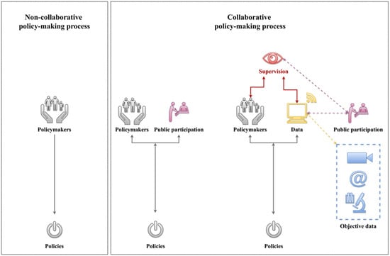 In line with the principle of parsimony [], the policy-making process could be simplified into two collaborative and non-collaborative processes [,]. A non-collaborative policy-making process often only involves policy makers. In other words, stakeholders’ input or feedback is often not involved in the process. On the other hand, the collaborative policy-making process not only involves the policy makers, but also stakeholders as well. As the process of policy making evolves, the degree of stakeholder involvement differs across contexts. However, regardless of how the collaboration takes place, this collaborative policy-making process nonetheless suffers from a key flaw—oftentimes both the policymakers and the stakeholders’ input are subjective. A schematic representation of these two policy-making approaches can be found in Figure 1.