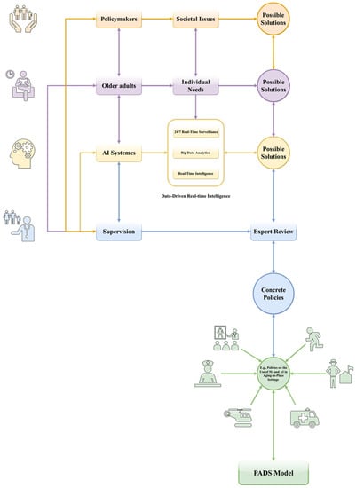 An example of applying the PADS model for developing policies on the use and application of 5G and AI technologies in the context of aging-in-place can be found in Figure 2. Overall, Figure 2 illustrates how the people-centeredness of the PADS model respects and reflects key stakeholders’ needs and preferences in the policy-making process, with the aid of advanced technologies such as AI-powered systems and comprehensive supervision mechanisms.