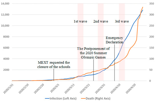 The number of the infected and the dead in Japan from 31 January to 26 April. Source: World Health Organization.
