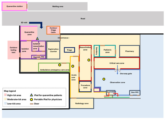 To segregate non-COVID-19 cases from suspected cases, all patients who visited the ED were diverted to separate areas according to their risks of potential COVID-19. We therefore regionalized our ED as high-risk, moderate-risk, and low-risk areas. Figure 1 shows the modified floor plan of the ED during the pandemic.