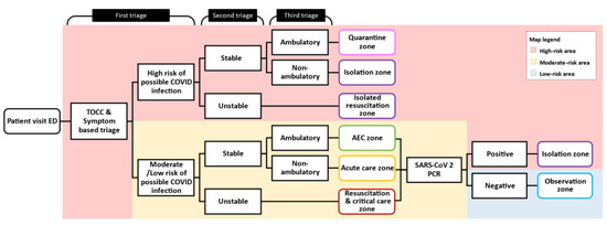 All patients who visited the ED were diverted to the designated areas according to their risk of COVID-19 infection. To accomplish this diversion policy and to streamline the process, the patient flow was modified into a triple triage protocol: (1) the first triage in the outdoor triage area to screen each patient’s history of travel, occupation, clusters of contacts, and symptoms; (2) the second triage to assess the patient’s vitals; and (3) the third triage to evaluate the patient’s ambulatory status. The protocol of patient flow is shown in Figure 2.