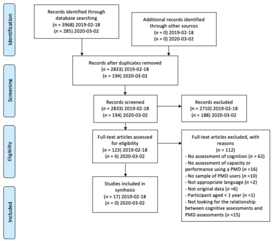 - Pellichero, A.; Kenyon, L.K.; Best, K.L.; Sorita, É.; Lamontagne, M.-E.; Lavoie, M.D.; Routhier, F. Influence of Cognitive Functioning on Powered Mobility Device Use: Protocol for a Systematic Review. JMIR Res. Protoc. 2020, 9, e16534. [Google Scholar] [CrossRef] [PubMed]