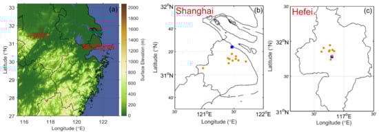 (a) Map showing the locations of Hefei and Shanghai in the Yangtze River Delta (YRD) and the locations of air quality (orange circles) and meteorological (blue squares) stations in (b) Shanghai and (c) Hefei.