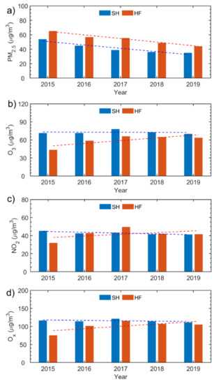 Air pollutant and meteorological data were simultaneously collected in SH and HF from 1 January 2015 to 31 December 2019. Real-time, hourly concentrations of air pollutants, including PM