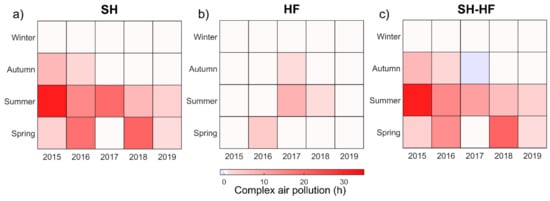 Joint histograms of seasons and years for complex air pollution hours for (a) SH, (b) HF and (c) SH–HF. SH–HF denotes the differences of complex air pollution hours between SH and HF. Abbreviations: SH—Shanghai; HF—Hefei.