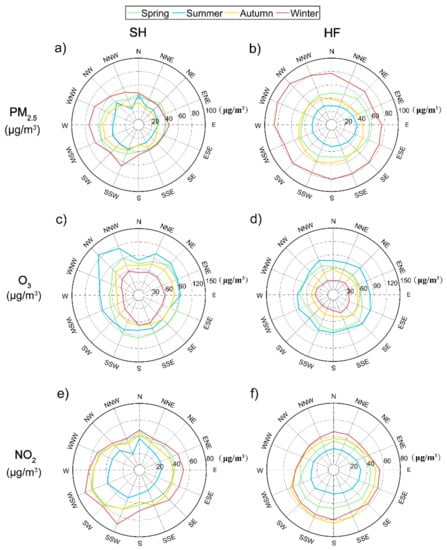 26]. HF is generally downwind of prevailing winds from the north and south in cold and warm seasons. In general, the coastal city of SH has better diffusion conditions than the inland city of HF. Air pollution deposition into the sea can largely reduce air pollutants near the coastal area as well [