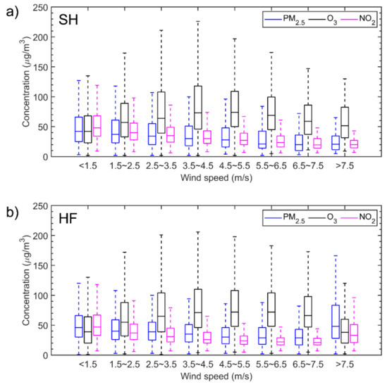Box and whiskers plot of hourly mean concentrations of PM2.5, O3, and NO2 in each category of wind speed in (a) Shanghai (SH) and (b) Hefei (HF).