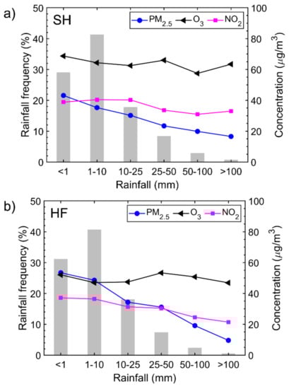 Daily rainfall frequency statistics (gray bars) and average concentrations of PM2.5, O3, and NO2 (colored curves) for each rainfall intensity category in (a) Shanghai (SH) and (b) Hefei (HF).