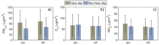 Daily mean concentrations of (a) PM2.5, (b) O3, and (c) NO2 on hazy days (grey bars) and non-hazy days (blue bars) in Shanghai (SH) and Hefei (HF). Error bars denote the standard deviations.