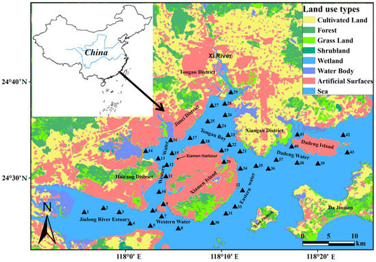 Sampling sites for surface sediments in Xiamen Bay (▲: Sediment Sampling; 1–43: Station numbers).
