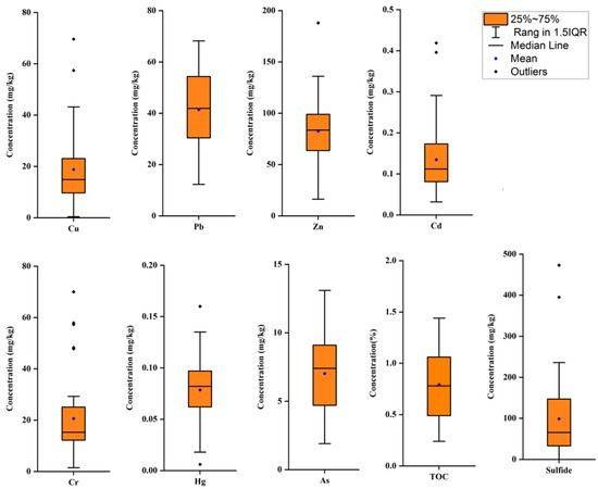 Box diagram showing the average contents of PTEs, TOC and Sulfide in Xiamen Bay.