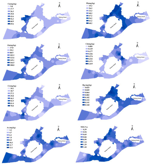 Spatial distribution of the PTEs contents (including Cu, Pb, Zn, Cd, As, Cr and Hg) and TOC in the surface sediments of Xiamen Bay.