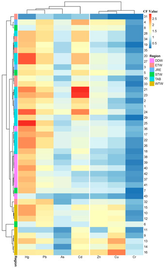 The contamination factor (CF) was deemed a useful method to evaluate the accumulation of PTEs in surface sediments over time [53]. The cluster heatmap of CFs from all sampling sites is presented in Figure 4. The CF ranges of copper, lead, zinc, cadmium, chromium, arsenic and mercury in the surface sediments of Xiamen Bay were 0.03 to 4.64, 0.62 to 3.41, 0.25 to 2.89, 0.49 to 6.45, 2.07 to 0.03, 0.25 to 1.70, 0.24 to 6.40, and 0.19 to 1.96, with average CFs of 1.25, 2.07, 1.27, 2.07, 0.34, 0.91, 3.14 and 1.21, respectively (Table 2, Figure 4). Among the different research areas, the Western Waters had the highest average CFs for Cu and Zn, and Tongan Bay had the highest mean CFs of Pb, Cd and Zn. The highest average CFs for Cr (0.6) and As (1.1) were all in the Southern Waters. The CF results showed that Xiamen Bay had low contamination levels and was moderately polluted by Cu, Pb, Zn, Cd, Cr and As, and it had low pollution to very high contamination levels of Hg. Hg had a maximum CF at site D25 in Tongan Bay, indicating that these sites were highly contaminated, and 27 of the 43 stations were considerably polluted by Hg.