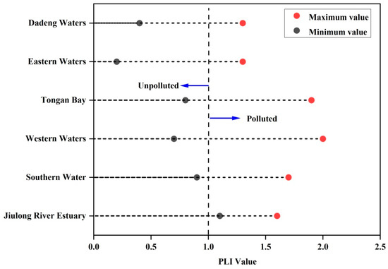 Lollipop chart of the pollution load index (PLI) in the subregions of Xiamen Bay.