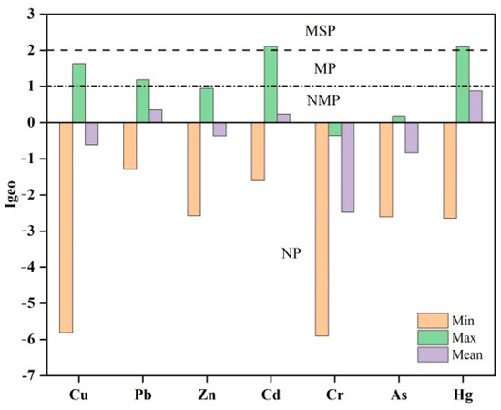 According to the Igeo value, the pollution degree of PTEs in sediments can be divided into 7 levels [41,42]: