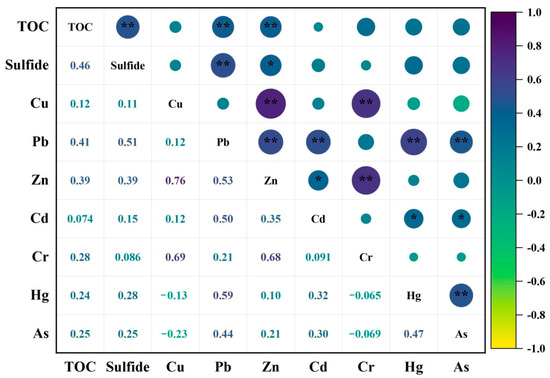 Correlation analysis of PTEs, TOC and sulfide in the surface sediment of Xiamen Bay (* p ≤0.05, ** p ≤ 0.01.).
