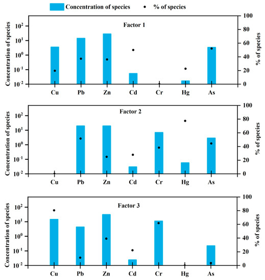 In the present study, positive matrix factorisation (PMF) was used to further explore the sources of PTEs in the surface sediment of Xiamen Bay. The trend of the source composition spectrum and contribution rate of three factors of PMF source analysis is shown in Figure 9. Factor 1 had the highest contribution rate to Cd and As and the lowest contribution rate to the total amount and concentration of Cr. Previous studies have shown that As and Cd are generally considered to be related to the use of chemical fertilisers and pesticides in human agricultural activities. Factor 1 was the input of chemical fertiliser and medication from human activities.