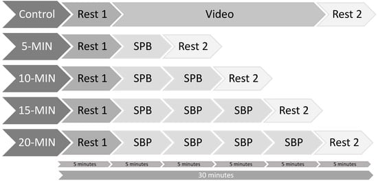 To sum up, the current study aimed to address the previous research gap concerning the dose-response relationship of a single SPB session realized without biofeedback on CVA. Specifically, we aim to systematically manipulate the duration of SPB, by applying durations of 5, 10, 15, and 20 min, in comparison to a control condition in which no SPB was performed. Based on recommendations for HRV investigation in psychophysiological experiments [22,34], a within-subject design was adopted. Through previous research, we hypothesized a condition effect, in which all SPB conditions would show a higher CVA during the intervention. No specific hypotheses were made regarding the dose-response relationship, due to the absence of a theoretical rationale or previous work on the topic. As a secondary outcome and manipulation check, RF will be measured.