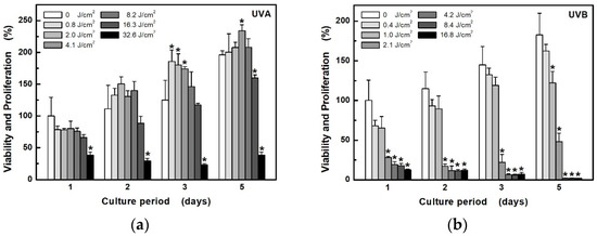 Development of HaCaT cell viability and proliferation capacity after exposure to different doses of UV radiation: (a) UVA at unweighted irradiances of 6.8 mW/cm2; (b) UVB at unweighted irradiances of 3.5 mW/cm2. Cell viability and proliferation were determined by measuring the activity of living cells using the MTT for the next 5 days. Values represent mean ± S.E. from 4 independent experiments. * Significant difference compared to non-irradiated cells (p < 0.05).