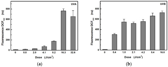 Dependence of ROS production in HaCaT cells on radiometric dose: (a) for UVA radiation at unweighted irradiances of 6.8 mW/cm2; (b) for UVB radiation at unweighted irradiances of 3.5 mW/cm2. Each value represents mean ± S.E. from 8 independent experiments.