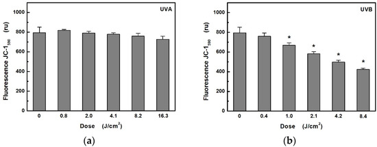 Effects: (a) of UVA; (b) UVB radiation on mitochondrial membrane potential in HaCaT cells were determined by measuring the fluorescence of JC-1 probe. Values represent mean ± S.E. from 3 independent experiments. Dose values correspond to unweighted exposure doses. * Significant difference compared to non-irradiated cells (p < 0.05).