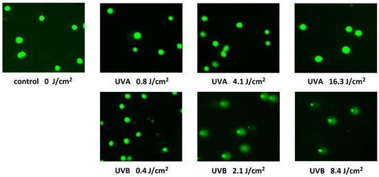 Fluorescence microscope images of the Comet assay acquired after 24-h exposure of HaCaT cells to UVA and UVB radiation for different unweighted doses. Images represent typical images of comets on dozens of microscope fields of view.