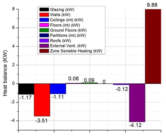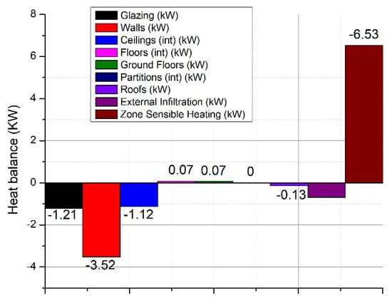 Furthermore, the meteorological data including the exterior temperature, wind speed, wind direction, exterior pressure, or solar radiation were set for the region where the construction was found for a whole simulation year (Latitude–46.78°, Longitude–23.570°, ASHRAE climate zone 5A). Having all the data set, the next step was to extract the results from the simulation program. The maximum heating load of the construction presents values of approx. 6.52 kW (see Figure 5 for details).