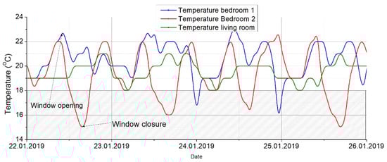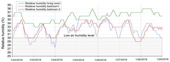 Figure 9 and Figure 10 show the evolution of the indoor air temperature and the relative humidity during the measurement campaign for all three rooms analyzed. It can be seen the fact that the indoor air temperature presents values evolving from 15 °C up to 23 °C for different periods of time with a mean value around 21 °C, which is the set point value in the two bedrooms, respectively 20 °C in the living room. The moments when the windows were open the air change rate raised and therefore, we had a sudden drop in the indoor temperatures. The graphic also reveals the fact that the parents’ bedroom has a higher rate of windows openings than the other two rooms. Nonetheless, the second graphic is showing the evolution of the relative humidity which presents almost constant values for the rooms around 30% which represents dry air that can cause multiple respiratory problems. Normally the air humidity should be in the range of 40–60% for best comfort. On the other hand, it could be highlighted that the living room has higher values of relative humidity. This could be since the kitchen is communicating with the lounge and the kitchen usually has a higher level of moisture released from the food and its preparation stages.