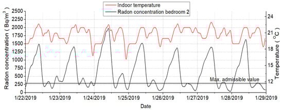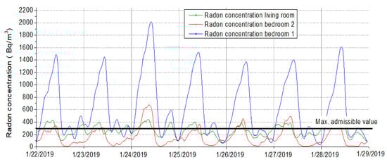 Figure 11 shows the indoor air concentrations of radon during the experimental campaign for the three rooms analyzed []. It can be observed that the child’s bedroom (bedroom 2) presents high radon concentrations which during night periods could go up to 2000 Bq/m3. These concentrations represent a serious threat to the health of the occupants. Moreover, the other analyzed rooms present lower values that usually do not raise over 500 Bq/m3. Nonetheless, the radon concentrations also present values that go up more than the maximum allowed concentration within enclosed spaces []. Figure 12 is revealing that the highest radon concentrations were recorded for the period between 12:00 am–4:00 am when the occupants were asleep, and the windows closed–typical winter situation. Moreover, from the same measurements, it could be highlighted the moments when the windows had been opened and the fresh air coming from the outside replaced []. For instance, regarding the child’s bedroom, the window was usually opened around 09:00 am until 1:00 pm. During this time the radon concentration drops at around 150 Bq/m3 [].