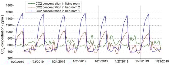 Figure 12 showed the evolution of the CO2 concentrations of the indoor environment during the experimental campaign. It could be revealed that the concentrations of CO2 are reaching higher values due to the presence of occupants and no fresh air []. Moreover, the parents’ bedroom reaches extreme CO2 concentrations because of the number of occupants. A similar pattern was observed for the CO2 concentration– huge accumulations during nighttime and rapid drop in the morning when the windows were opened.