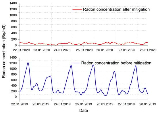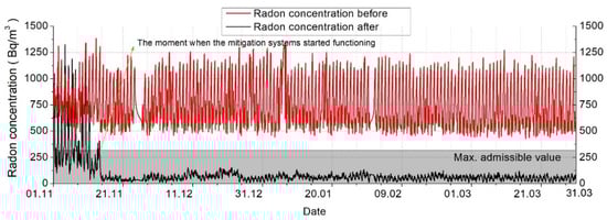 As can be seen in Figure 15 and Figure 16, the radon concentration has been reduced drastically. Before any mitigation method was applied, extreme radon values were recorded, reaching frequently 1300–1400 Bq/m3. As can be seen, important fluctuations were recorded daily, due to the temperature differences and natural ventilation occurring. In the first days exposed in Figure 16, we can clearly see the commissioning of the mitigation systems, and how fast the radon concentration decreased to a normal value.