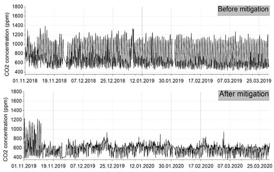 - Using the mitigation systems, the temperature stabilizes at the setpoint, 21 °C, not oscillating anymore to low values. While the indoor air temperature presented a comfortable value and the heating system was functioning in good energy parameters, the indoor relative humidity established to a normal level of 750 ppm, high values like before the installation of mitigation system were not recorded anymore.
