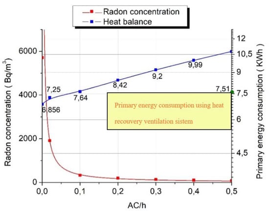 Figure 18 presents the impact of the air changes per hour for both indoor radon concentration and primary energy consumption for our room determined for the same period as the measurements. It can be observed that a 0.1 h−1 could greatly impact the indoor radon concentration lowering its value around 350 Bq/m3 []. An 0.2 h−1 seems to lower the concentration enough to be under the maximum indoor limits, with a rise in the energy consumption of around 13%. From this moment, the growth of the air change rate does not have an important impact on the radon concentrations and it could be seen that a drop of around 50% in the radon concentration, corresponds to a 9% rise in energy consumption. It is important to understand that these primary energy consumptions were determined only for the five days of measurements and thus.