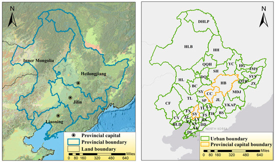 Administratively comprising the provinces of Liaoning, Jilin and Heilongjiang and the four eastern leagues of Inner Mongolia, Northeast China is rich in natural resources and well-developed agriculturally, making it an important grain-producing region in China. The industry is the backbone of the national economy and main source of fiscal revenue in Northeast China [24]. The geographical location of the study area is shown in Figure 1.
