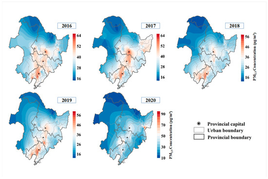 Spatial distribution of PM2.5 concentration in Northeast China from 2016 to 2020.